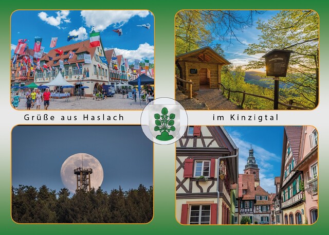 Ansichtskarte von Haslach im Kinzigtal mit 4 Fotos und Haslach-Wappen in der Mitte, Rückseite standard. Mindestabnahme 25 St.